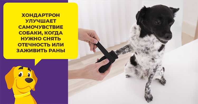 Хондартрон улучшает самочувствие собаки, когда нужно снять отечность, заживить раны, уменьшить спазмы. Лекарство подходит всем породам. Прекрасно справляется с воспалениями связочного аппарата. В сочетании с антибиотиками ускоряет выздоровление, что помогает существенно сократить курс лечения. Это особенно актуально для животных в почтенном возрасте.