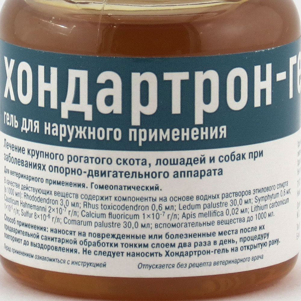 В состав Хондартрона входят специально подобранные гомеопатические компоненты: сабельник, рододендрон, пчелиный яд, багульник, фторид кальция, карбонат лития и т.д. Эти вещества позволяют восстановить разрушенные соединительные ткани и предотвратить дальнейшие дегенеративные изменения. Ветпрепарат ускоряет обменные процессы, блокирует воспаление, снимает отечность, купирует спазмы, стимулирует заживление травмированных костей, хрящей и суставов.