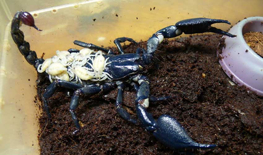 Все скорпионы живородящие. Период вынашивания самкой детенышей может быть от полугода до года. После этого на свет появляются 20-30 крупных малышей, которые взбираются на спину к самке и дней 10 ничего не едят. Потом наступает первая линька. После нее самку нужно отсадить от малышей и кормить их небольшими насекомыми, о которых я писал выше.