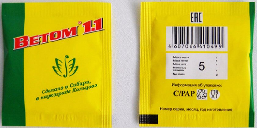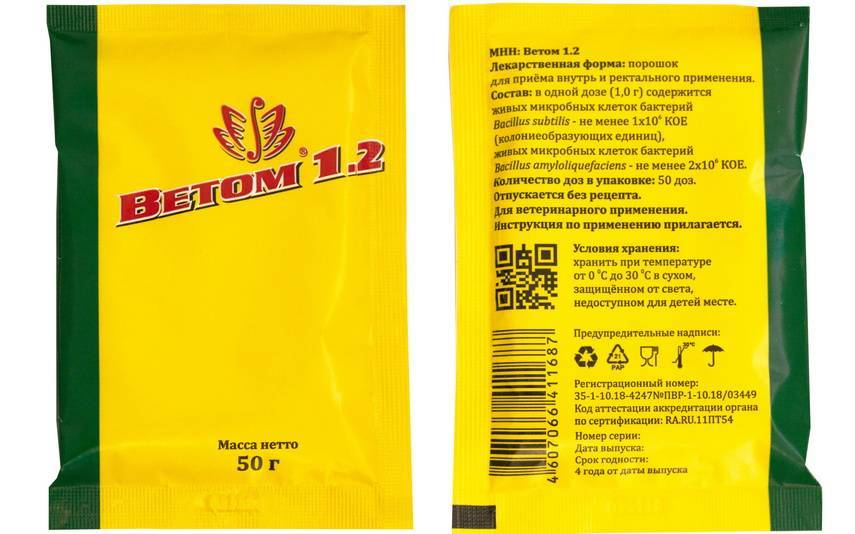 1.1. Ветом 1.1 представляет собой белый порошок без запаха, сладкого вкуса, легко растворимый в воде. Препарат выпускается в фасовках по 5 и 50 грамм. Срок годности препарата — 2 года со дня изготовления. В состав препарата входят следующие основные компоненты: бактерии Bacillus subtilis; пищевой наполнитель. Применяется препарат перорально в дозировке не менее 50 мг/кг веса теплокровного.
