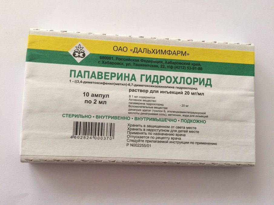 Форма отпуска: в форме инъекционного раствора это лекарство расфасовывается по 2 мл в ампулы из стекла. В картонной коробке находится 10 ампул. В 1 мл раствора содержится 20 мг папаверина гидрохлорида, а также D,L-метионин, вода для инъекций и динатрия эдетат.