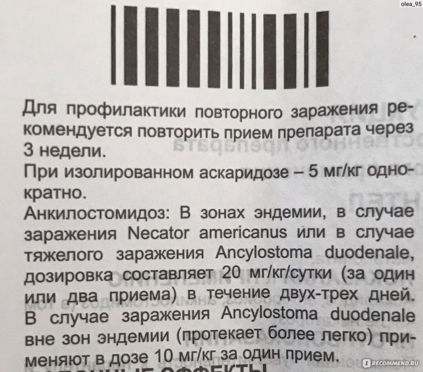 Как было отмечено выше, данный лекарственный препарат совершенно не работает против яиц паразитов, поэтому в рамках одного курса лечение не представляется законченным. Рекомендуется его повторить через 3 недели, то есть в то время, когда новые особи вылупятся из яиц, но не достигнут возраста, когда сами станут способны откладывать яйца.