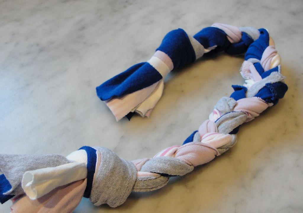 Для маленькой собаки можно сделать жгут из обрезков старых футболок. Нарежьте около 10 полос одинакового размера. Все концы с одной стороны завяжите в большой узел. Одной рукой держите скрепленные кончики, а другой перекрутите лоскуты. Свободную часть завяжите таким же узлом.