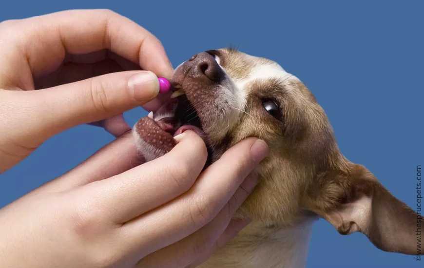 Можно заставить собаку проглотить таблетку. Для этого животное, которое находится в спокойном состоянии, необходимо посадить, приподнять её голову, аккуратно раздвинуть челюсти, положить в пасть таблетку, закрыть её и сделать лёгкий массаж шеи для стимуляции глотательного движения. Препарат нужно положить на корень языка. Нельзя класть таблетку в глотку, пёс может подавиться, он должен проглотить лекарство сам, естественным движением. Если питомец таблетку съел, во рту её нет, нужно сразу дать немного воды для удаления горького привкуса, качественного продвижения препарата.