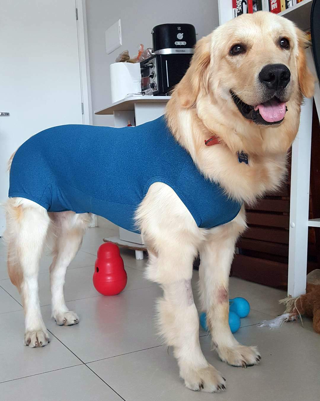 После операции по стерилизации и обработки швов, чтобы исключить попадание инфекции в рану, на собаку одевают специальную попону, а если надо, то и воротник. Послеоперационная попона необходима и для того, чтобы собачка не зализывала шов. А еще она поддерживает брюшную полость, препятствуя образованию грыж, расхождению швов.