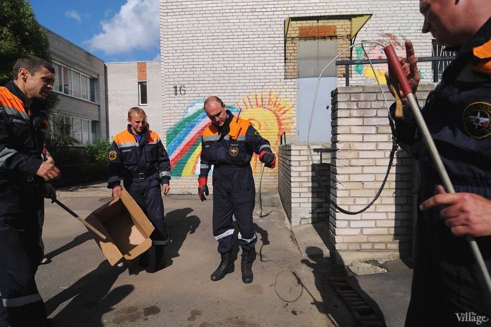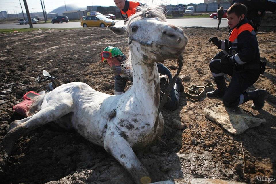 «Поступила заявка: лошадь в парадной, — вспоминает Мочалов. — Приезжаем. Точно. Лежит конь. В парадной. Между первым и вторым этажом». Как выяснилось, хозяйка коня зарабатывала тем, что катала людей в парке. Видимо, она решила устроить себе и коню выходной. Целый день выпивала у себя во дворе. Песни пела. Видимо, её муж обиделся на это. И запер дверь в квартире. И тут она решила, что подведёт коня к двери, а он ударит копытами и вышибет дверь. Ну повела коня на четвёртый этаж. Он поскользнулся и упал на бок, а его передние ноги застряли под перилами. Жильцам было не зайти, не выйти. Кто посмелее, пытался перепрыгивать, остальные ждали. Животному грозила скорая смерть, но спасатели вызволили его. Пьяной хозяйке его не могли отдать, поэтому повели в полицию. «Кличка у него, кстати, была Боинг», — добавляет Мочалов. Опытные спасатели за время работы накопили много нелепых историй: щенки в вентиляционных шахтах, кот, застрявший между окнами, ондатра в цементных блоках, осы в спальне детской подготовительной группы (правда, спасали детей, а не ос), полутораметровая змея с клювом под шкафом (у звонившего началась белая горячка). В отряде даже есть своя галерея с фотографиями самых героических вылазок.