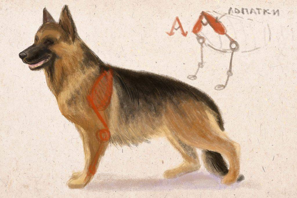 У собак нет ключицы, а лопатки расположены под острым углом. Это важная особенность, которая поможет правильно расположить передние лапы, показать рельеф и направление шерсти на этой части тела и на шее животного.