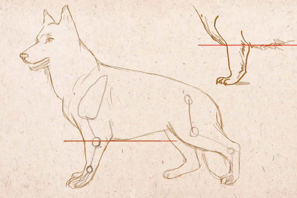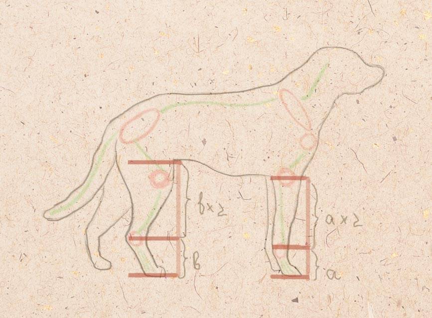 - Задние лапы: На задних лапах длина от нижней линии тела до пятки равна двум расстояниям от пятки до земли.