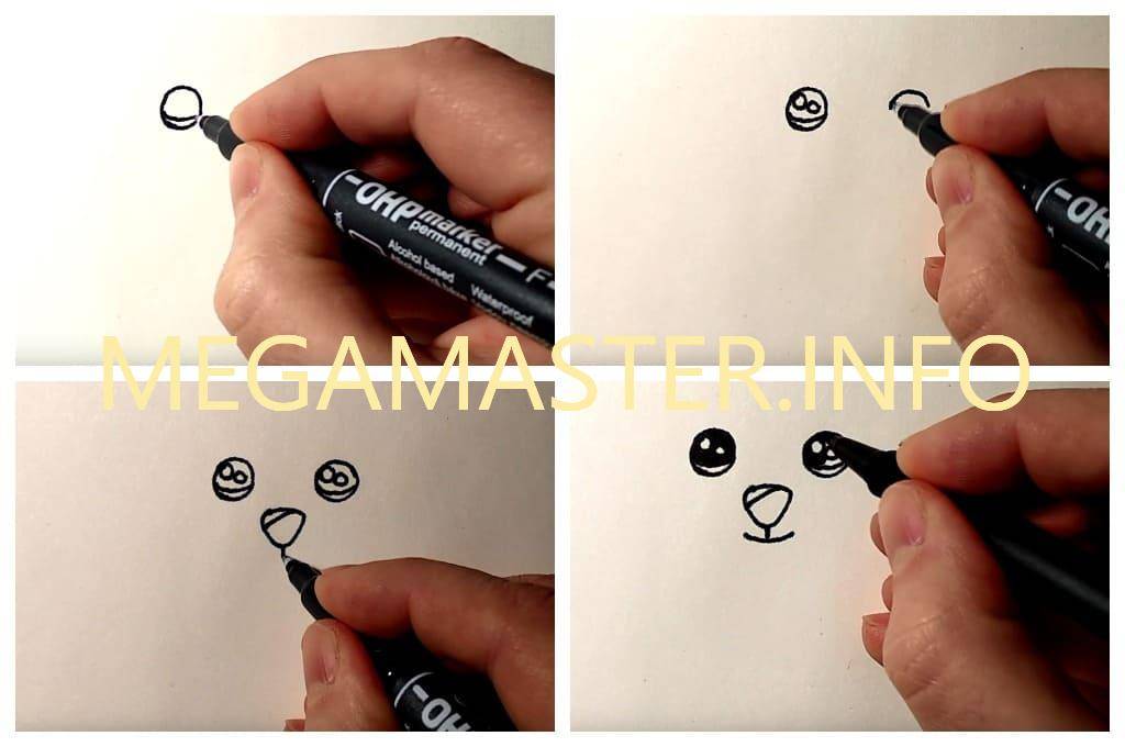 - Рисуем лицо с ушками, носом, ртом и глазами. Из-за этого: