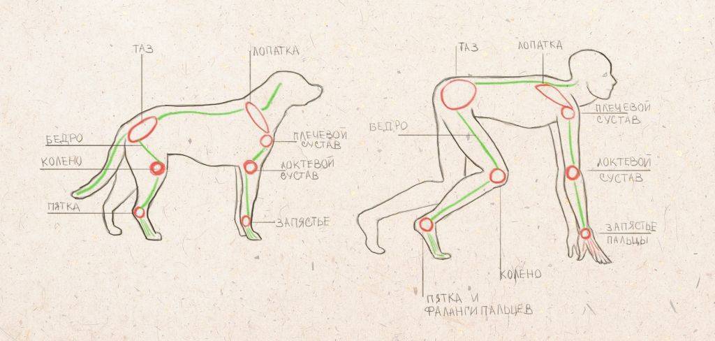 Максимальное внимание следует уделять конечностям, количеству суставов, тому, как и где они сгибаются. У собаки и человека в конечностях одинаковое количество суставов, и они работают одинаково: локти согнуты вперед, колени назад, есть плечо и бедро, движущиеся в разные стороны, есть пятка и пятка запястье — можно сгибать и растягивать вперед и назад