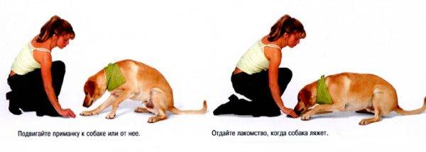 Так как уже описывался один из главных способов, как по приказу научить собаку лежать, можно добавить только, что такой способ подходит для щенков и для особей постарше. Главное показать рукой угощение и непроизвольно заставить к нему потянуться и лечь. Нужно чередовать похвалу с лакомством.