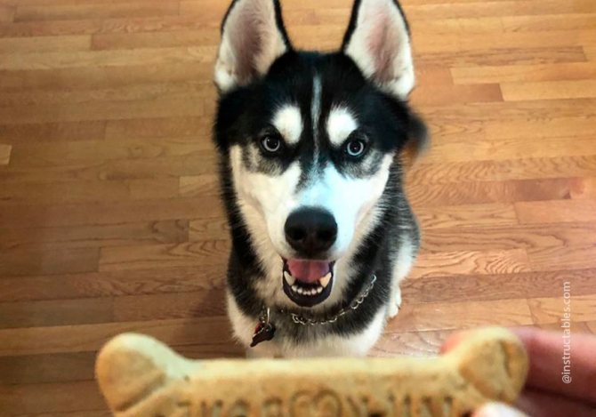 - Постепенно, можете завышать критерии. Теперь нужно, чтобы собака отвлекалась от еды именно в вашу сторону. Как только питомец отвлечётся от пищи и посмотрит на вас (в идеале в глаза) – дайте ему вкусное лакомство из рук.