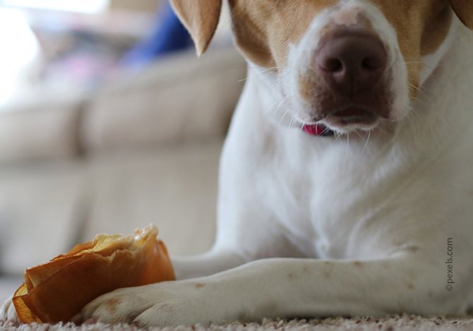 - Покажите животному, что у вас есть еда, и положите кусочек менее вкусного лакомства на пол. Не давайте собаке схватить кусок (ограничивайте с помощью поводка или просите помощника закрывать угощение). Сначала питомец будет всячески пытаться подобраться к лакомству – игнорируйте такое поведение. Как только вы видите, что на секунду собака отвлеклась от своей цели (обернулась, посмотрела в другую точку или на вас) – сразу кормите любимца более вкусным лакомством из рук. Повторите так несколько раз, пока пёс не поймёт, что попытки достать еду с пола ничего хорошего ему не принесут, а отвлечение от лакомства на земле наоборот же влечёт за собой поощрение от дрессировщика.