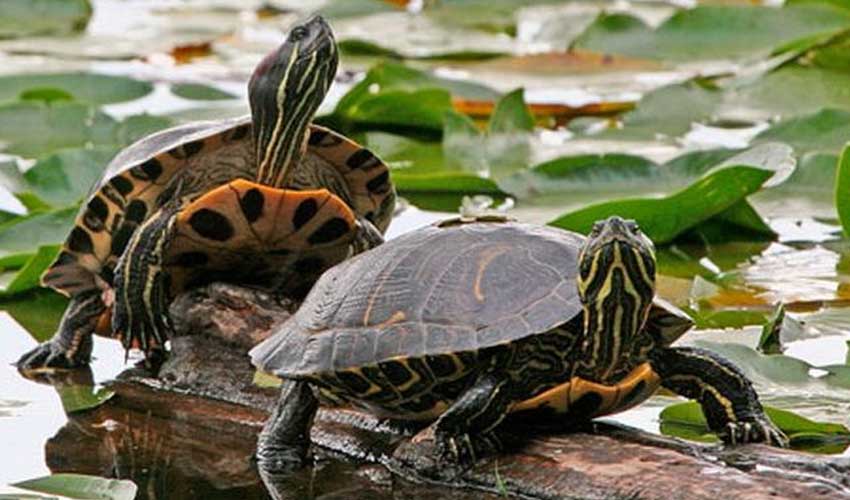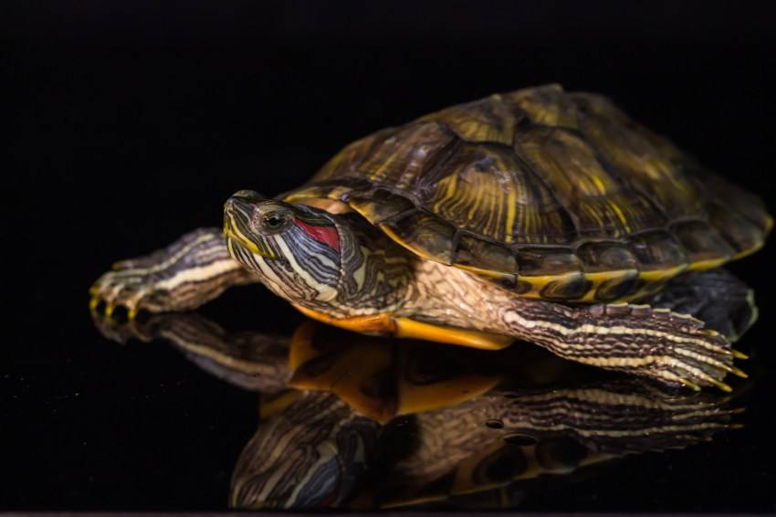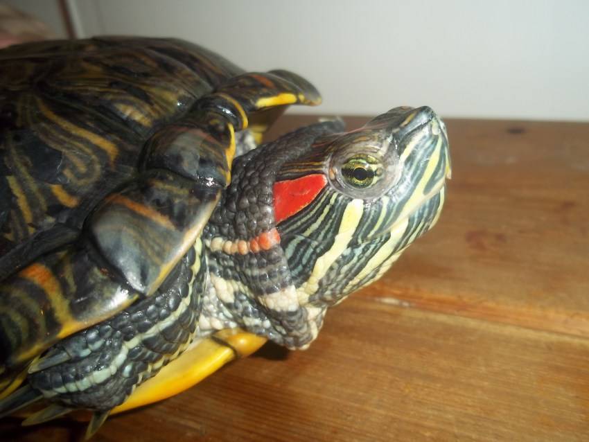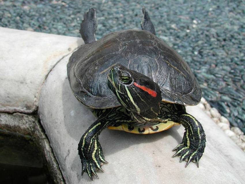 - Красноухие черепахи выделяются среди других представителей своего рода красной полосой на голове.