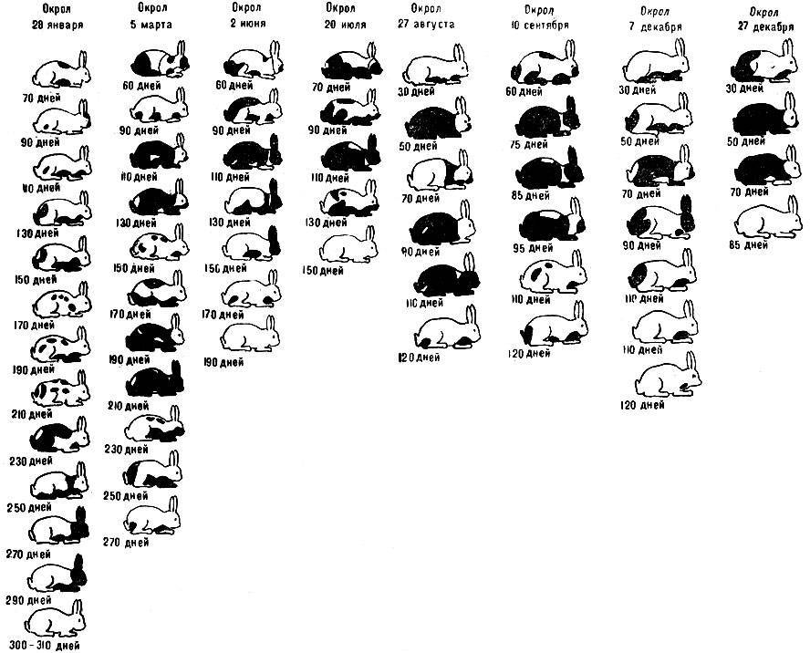 Крольчата появляются на свет без шерсти. Только к концу первой недели жизни они покрываются пухом. Меховое одеяние появляется через две недели после рождения. Первая линька начинается у месячного кролика. Длительность ее примерно 2 месяца. Шерсть тускнеет и сильно выпадает. На месте обновлений кожный покров белый. Другие участки кожи серые. После первой линьки наступает второй период. При правильном питании и подходящих условиях содержания, зверек приобретает красивую, мягкую и густую шерсть.