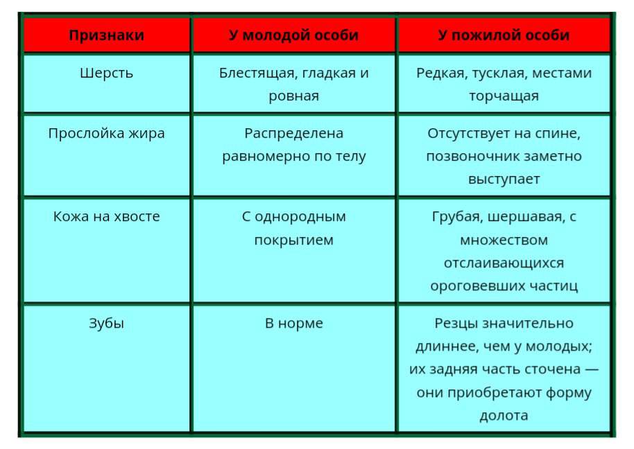 В период от полугода до года по сравнению с другими параметрами особенно активно растёт хвост грызуна. Определяя его возраст в период от 6 до 12 месяцев, можно взять это на вооружение.