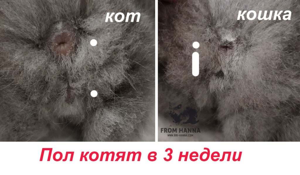 Отличия в том, что у новорожденных мужского пола отверстия будут выглядеть как две вертикальные точки, расстояние между которыми не менее 1 см. Между «двоеточием» будет проглядываться еще одна «дырочка» — со временем тут будет пенис. У маленьких котят женского пола под хвостом анус и вульва напоминают восклицательный знак и находятся рядом друг с другом.