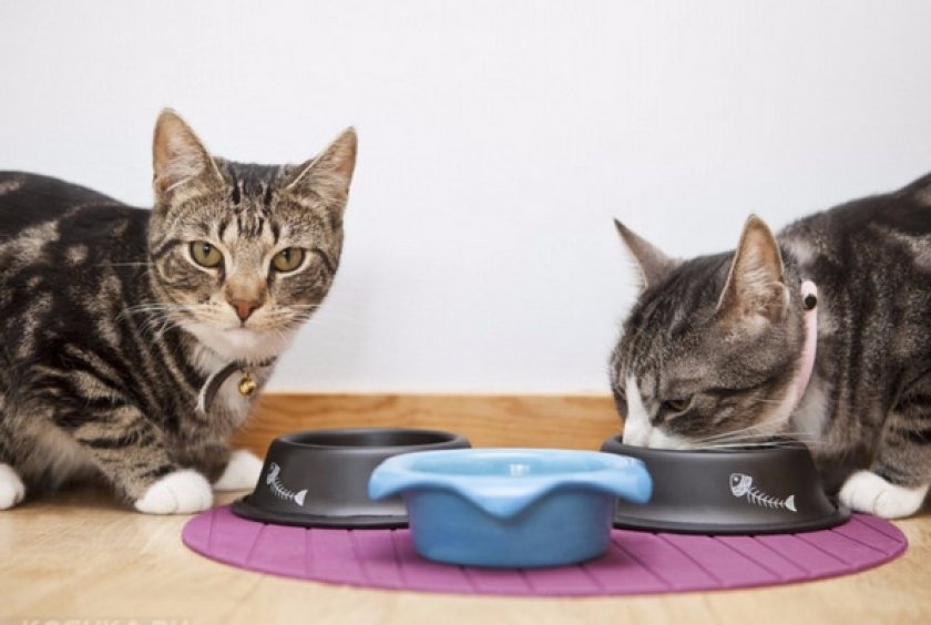 Нового питомца следует кормить из отдельной миски и лучше не в той комнате, где обычно ест старожил. Через время миски можно будет переместить в одно место и даже сдвинуть близко друг к другу. Но при этом всегда следует одновременно давать корм кошкам, чтобы у них не было желания отбирать еду друг у друга.