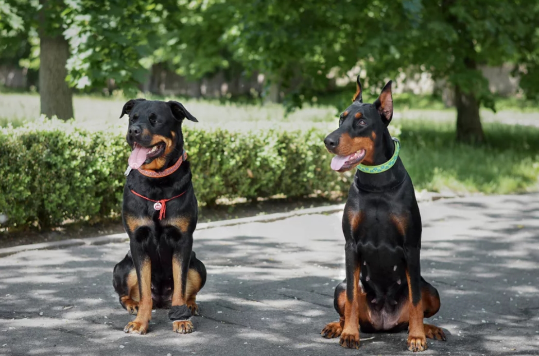 Короткошерстные, с темным окрасом (доберманы, пинчеры, ротвейлеры). У них мало шерсти для того, чтобы создать воздушную прослойку между нагретым воздухом и телом.