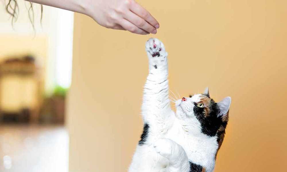 Дай лапу. Когда ваша кошка будет сидеть, возьмите ее лапу и скажите «дай лапу». После того, как она даст вам лапу, наградите ее лакомством. Повторяйте эту процедуру, пока кошка не начнет давать лапу на команду.