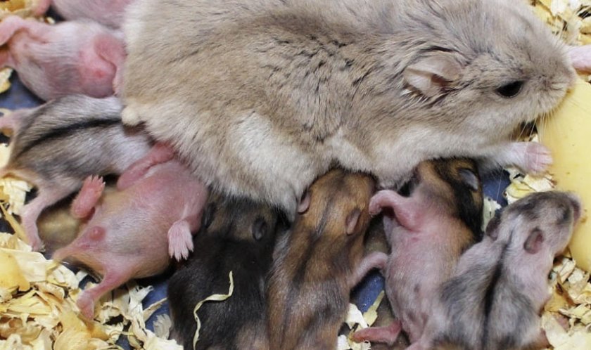Когда начинаются схватки, хомяк принимает характерную позу: садится на попу. В таком положении ей удобно помогать рождению щенков. Он буквально зубами вытаскивает их из родовых путей. Каждый новорожденный джунгарик находится внутри плодного пузыря. Мама ломает скорлупу, грызет пуповину и вылизывает малышей.