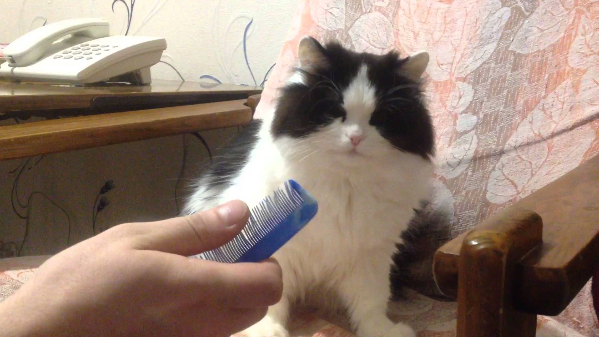 Вычёсывание длинношёрстной кошечки гребнем с металлическими зубьями различной длины