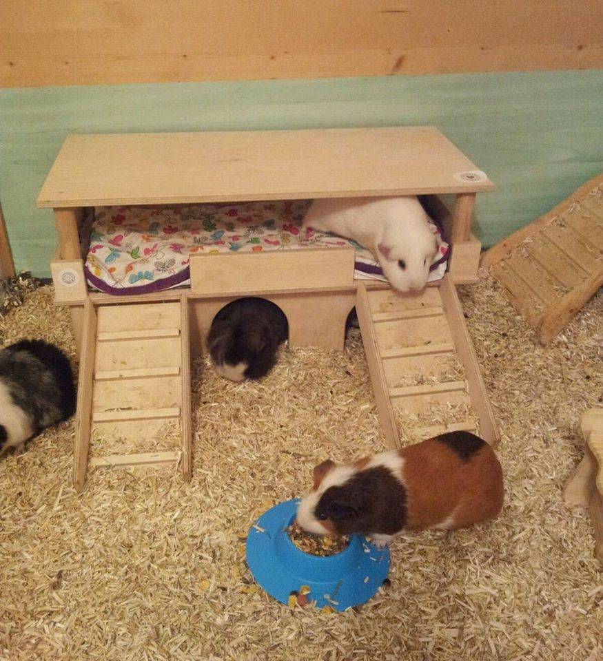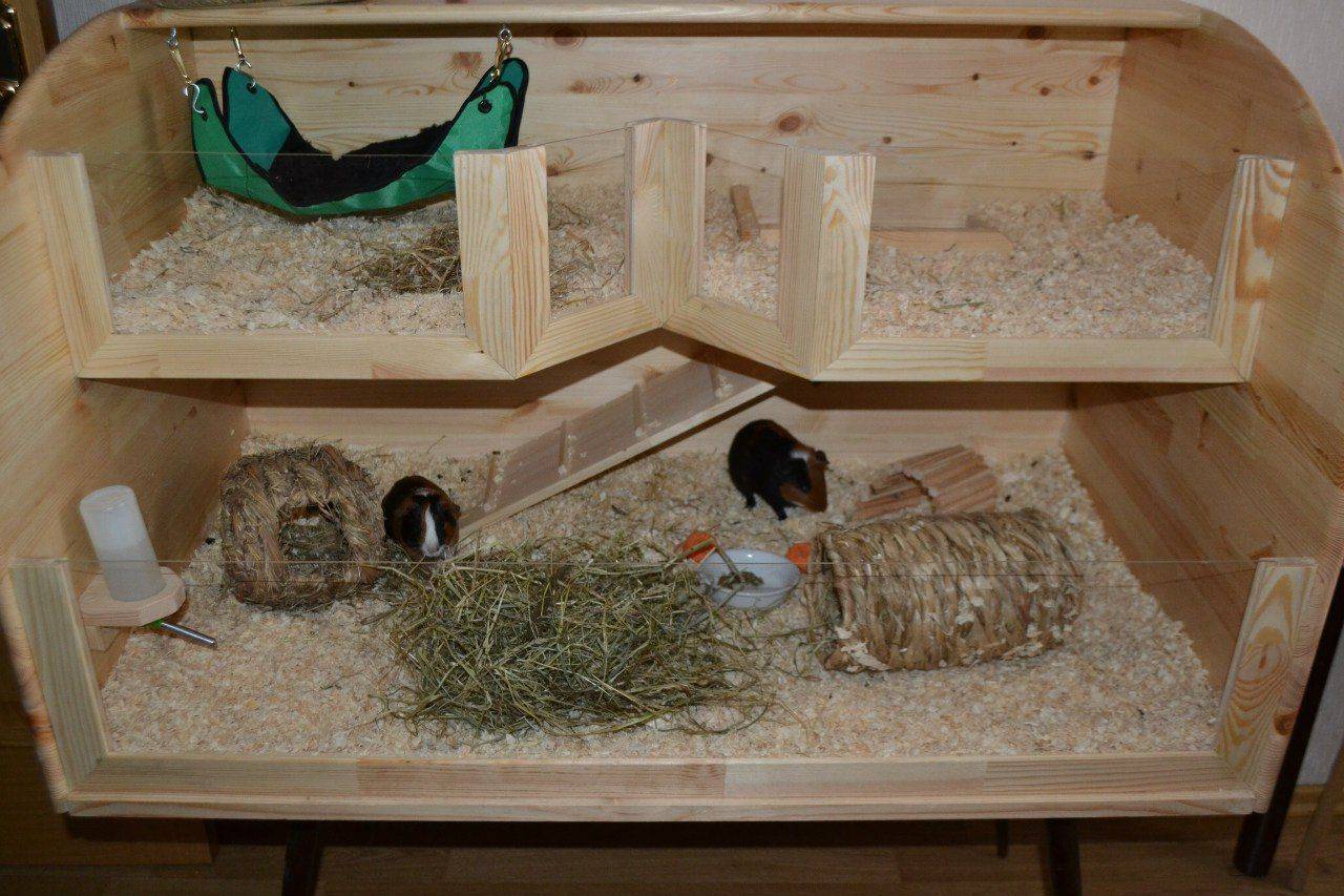 Свинке также понравятся полочки и возвышения. Не забудьте об игрушках — иначе грызун возьмется за детали своего жилища. Для того, чтобы зверькам было удобно подниматься на второй этаж, лучше поставить не проволочную лестницу, а пандус — плоскую широкую дощечку с приклеенными рейками.