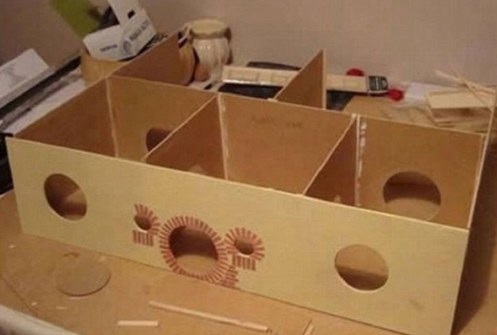 Для более сложного домика понадобятся как минимум 2 коробка разных размеров. Больший внизу, на его «крыше» крепиться меньший. Лесенку надо сделать с таким расчетом, чтобы хомяк мог свободно забираться в верхний домик.