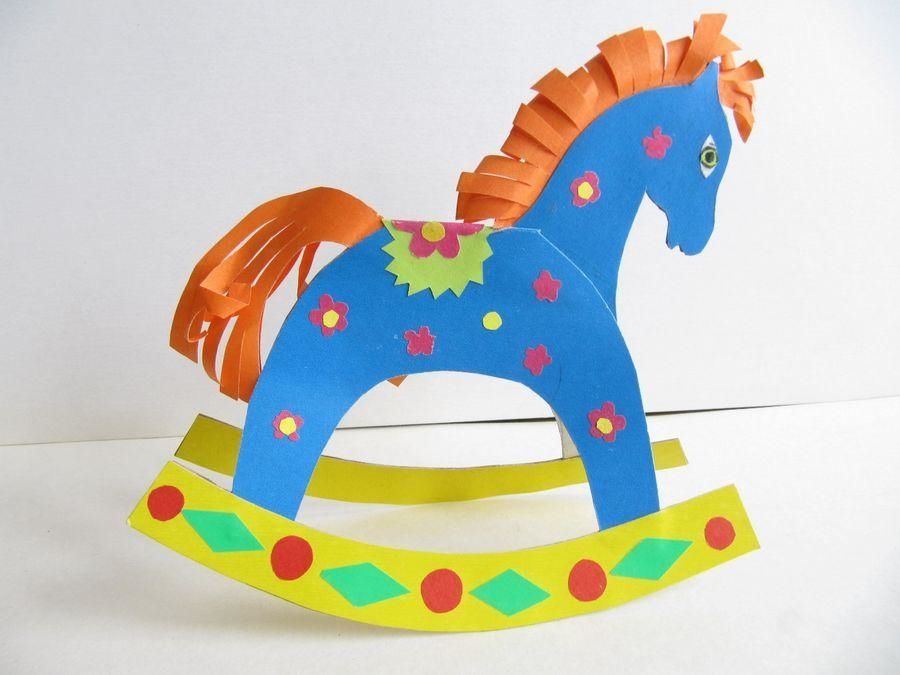 Такая версия лошадки качалки считается самой простой и интересной. Детям точно понравится её делать, так как в неё нет никаких сложностей. Достаточно свернуть «туловище» в трубу и склеить. Отдельно вырезать подставку, которая будет качаться.