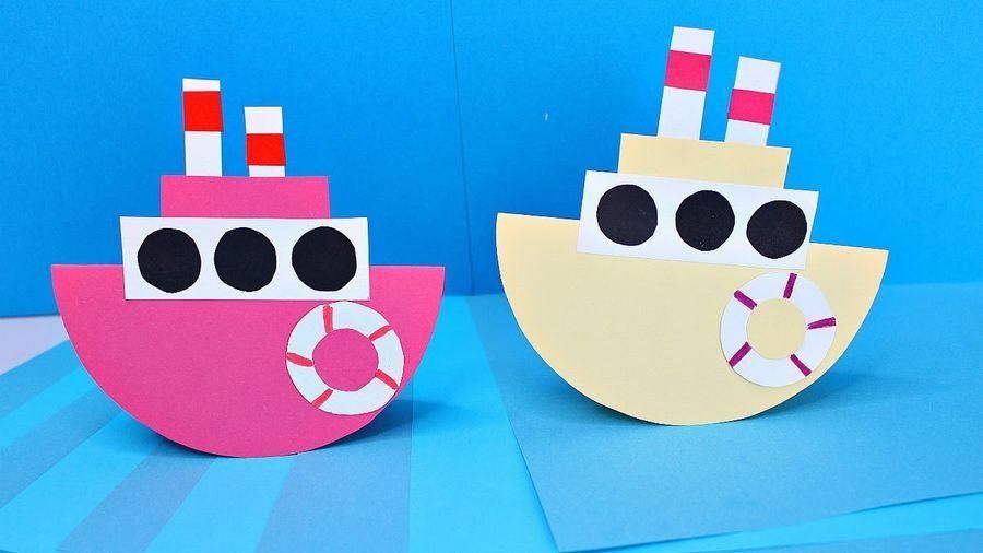 Делать игрушку качалку можно как из обычной бумаги, но в дальнейшем разукрасить её, а можно взять уже готовую цветную. Такие кораблики у вас получатся всего за пару минут.