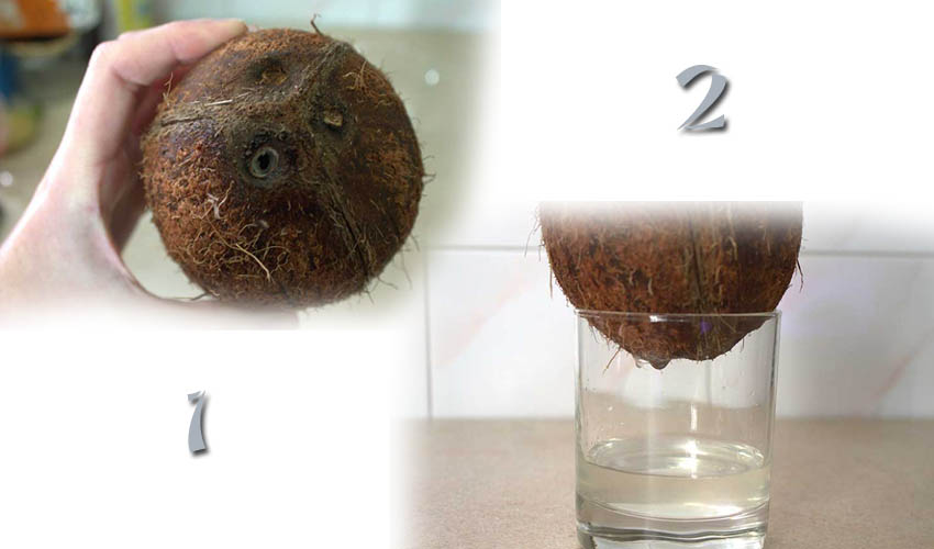 Через проделанную дырочку выливаем весь сок в стакан. Оставьте кокос в таком положении на 5-10 минут, чтобы сок полностью стек.