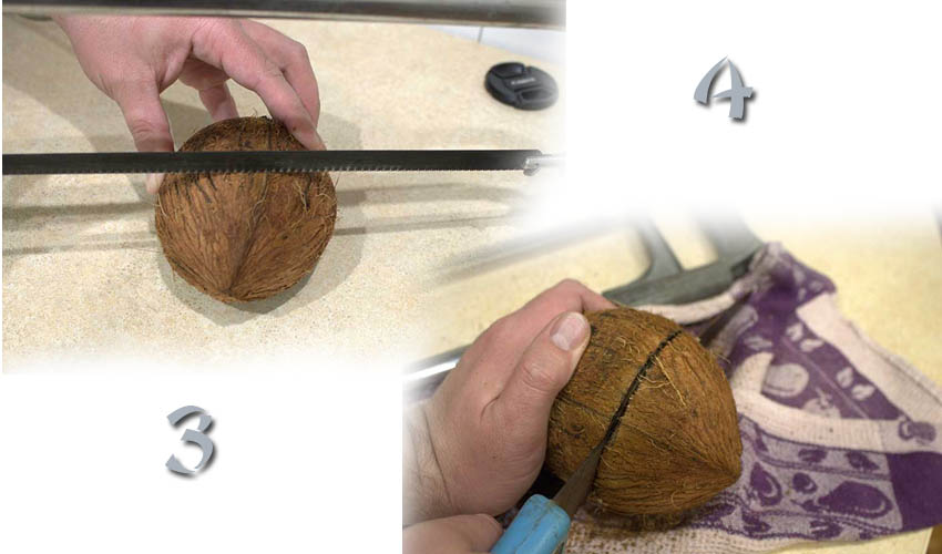 Используя ножовку по металлу начинайте пилить кокос. Не обязательно делать распил ровно по середине. При распиле учитывайте размеры Вашего питомца.
