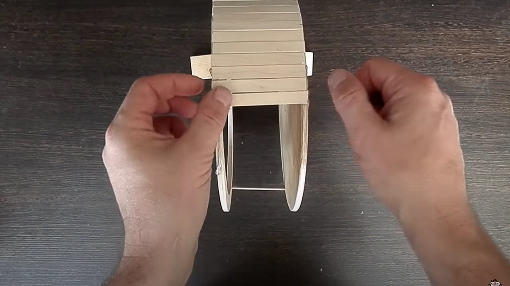 В первой боковушке проделывается дырка, а на второй и задней намечается проем для вентиля. Теперь по размеченному материалу вырезаются заготовки и склеиваются. Фиксируем крышу и созданную конструкцию переворачиваем. Изнутри размечаем места для будущих реек и приклеиваем их.