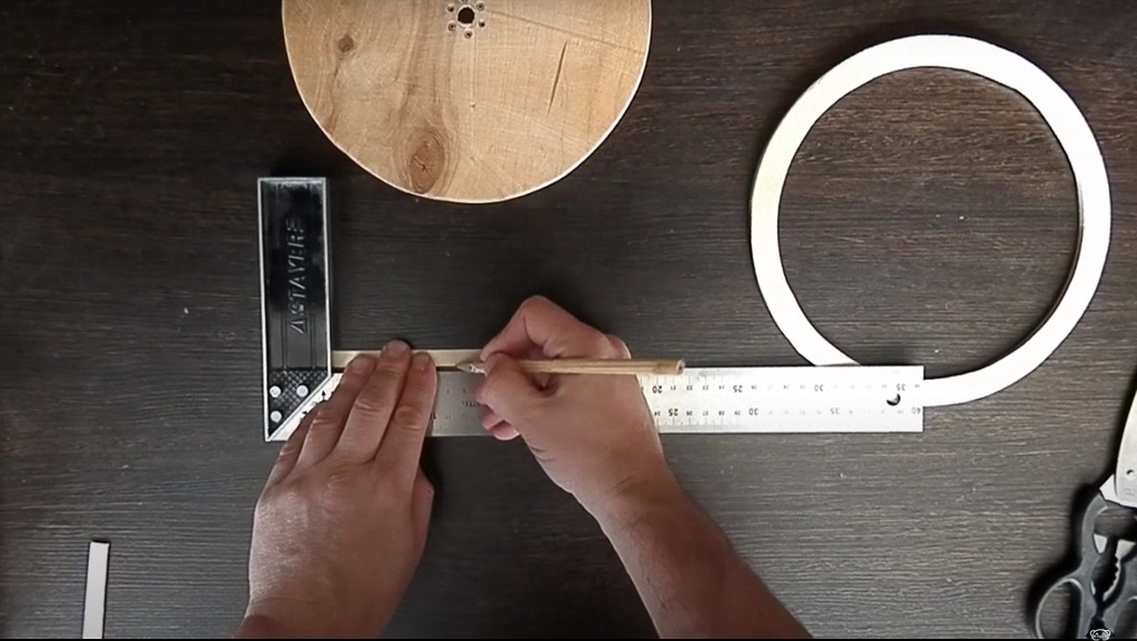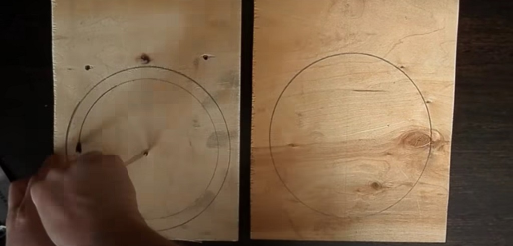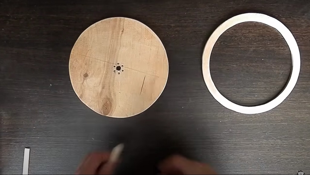 Шаг 1. С помощью циркуля делаем разметку на фанере: чертим окружность радиусом 11 см, а затем вписываем в нее окружность радиусом 10 см. Таким образом обозначаем круг-основу для колеса и наружное кольцо для фиксации.