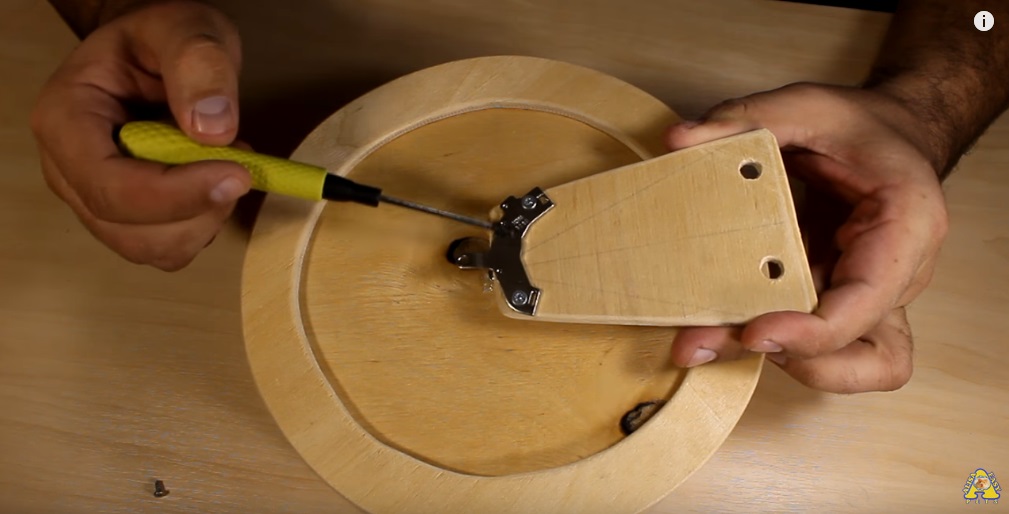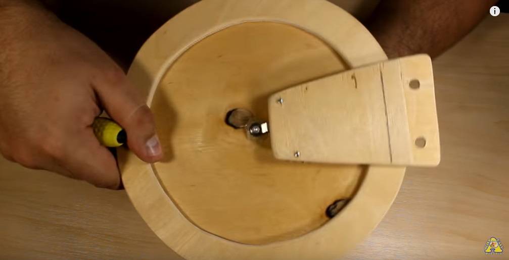 Шаг 7. При необходимости делаем крепление, чтобы можно было повесить колесо в клетку. Для этого вырезаем из фанеры деталь, которая показана на картинке, и прикручиваем к ней запчасть из жесткого диска (можно взять любую другую подходящую деталь). Вот что должно у вас получиться: