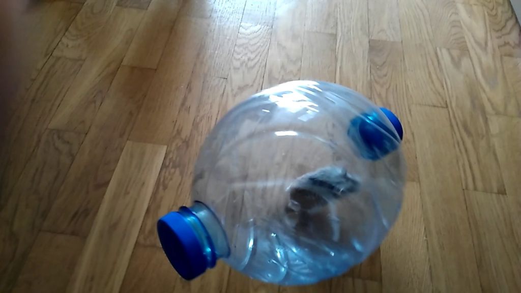 В стенках бутылки рядом с горлышком сделайте продолговатые (длиной 6-8 мм) узенькие (шириной 1-2 мм) прорези, которые также обеспечат циркуляцию необходимого количества воздуха внутри сферы. После этого зачистите новые отверстия нождачкой и соедините части обеих бутылок в одну сферу с помощью скотча. Следите, чтобы сера получилась достаточно симметричной, и зверёк имел возможность перемещаться в ней по квартире.
