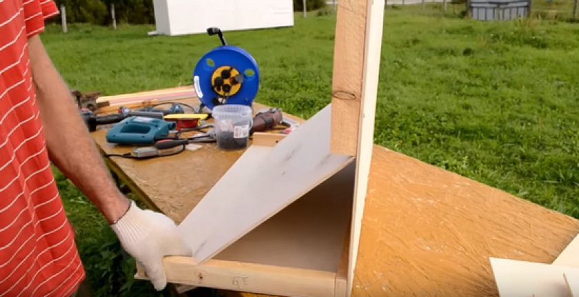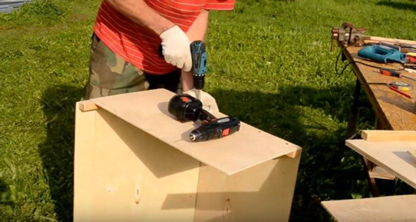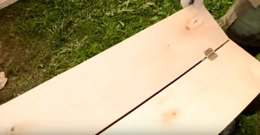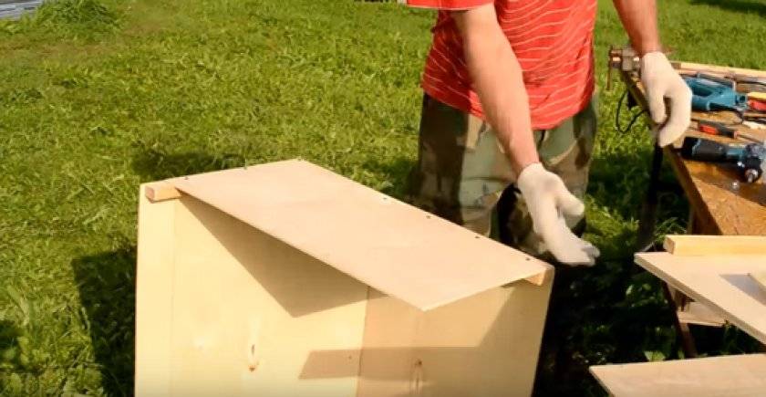 Сооружаем крышу. Для этого нам понадобится лист фанеры и петли, как на дверях или шкафчиках. В начале прикручиваем петли к одному из верхних брусьев каркаса, затем на них же садим лист хорошей фанеры. Тут лучше выбрать материал потолще, потому что крыша домика будет постоянно подниматься и опускаться. Позаботьтесь о том, чтобы она прилегала плотно. Если между каркасом и крышей будут большие щели, не избежать вредных сквозняков.