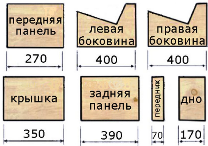 - Для двустороннего внутреннего сенника (на чертеже обозначен буквой В) возьмите деревянную доску или брус шириной 10-15 см, выпилите из нее детали будущей кормушки. Нам понадобятся 4 детали для боковушек длиной 40 см и 3 детали для верха и основания по 50 см каждая.