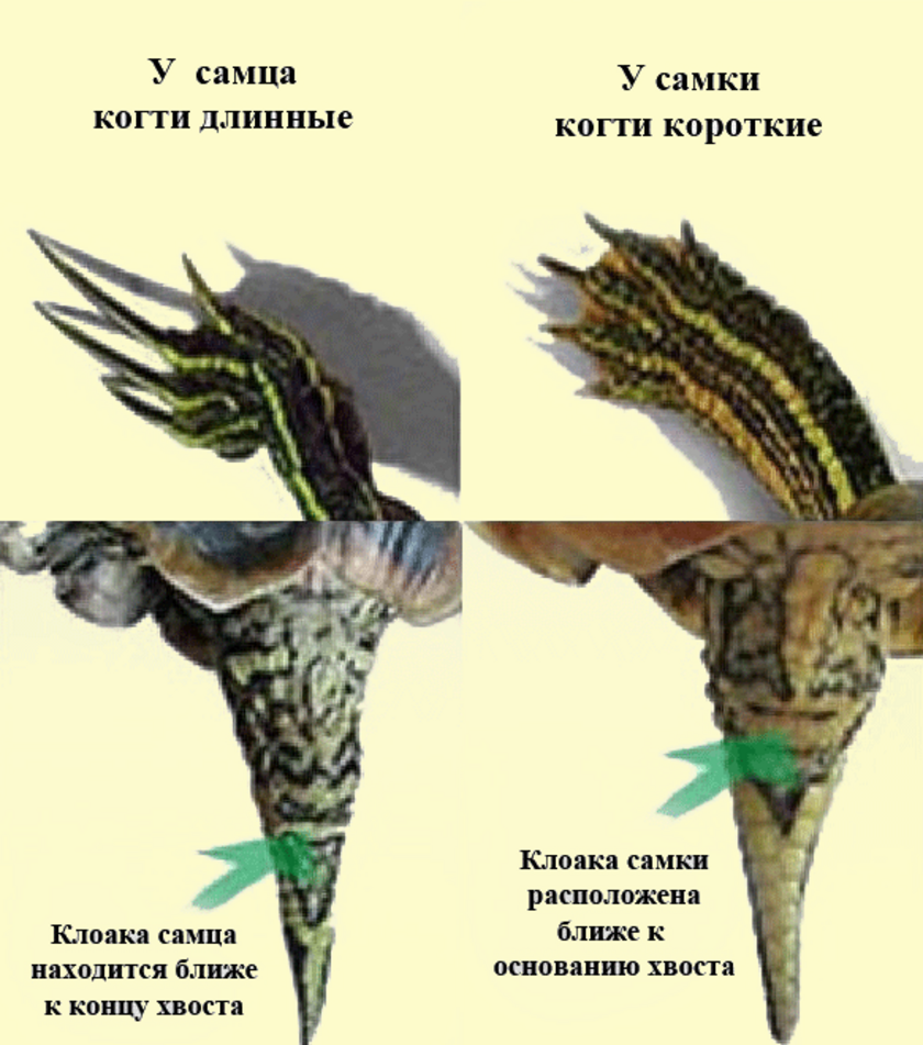 Пол рептилии определить бывает нелегко. Но при внимательном осмотре и сравнении разнополых особей, видно, что отличия всё-таки есть. Например, коготки на конечностях у самца длиннее и твёрже, нежели у самок. Брюшная сторона панциря «парня» вогнутая, бедренные шпоры массивные. Хвост длиннее, округлый и шире у основания, ведь в нем находятся половые органы. Панцирь прикрывает его собой.