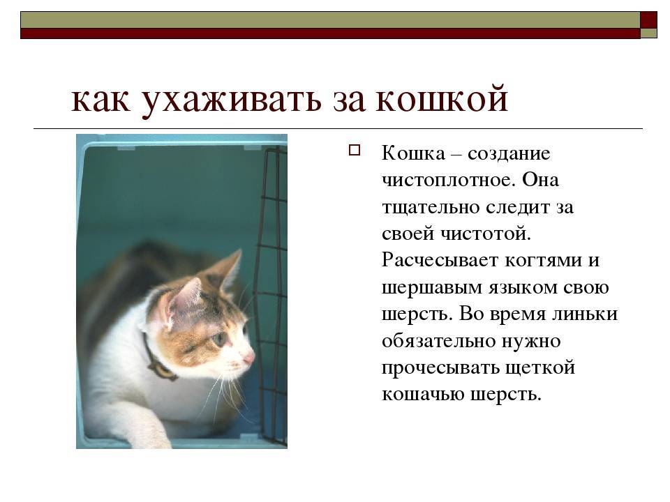 Кошке нужно подстричь когти на передних лапах. Внешний вид кошки не должен смущать хозяев кота – кошка должна выглядеть ухоженной, упитанной, чистой, без подтеков под глазами, с чистыми ушами, и конечно, без блох.