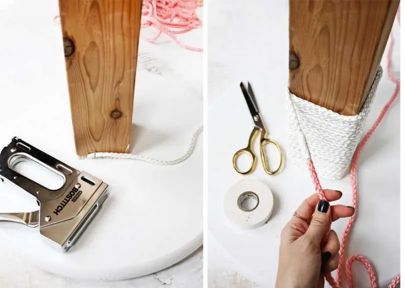 Смазывая поверхность клеем (примерно на 10 см за раз), плотно наматывайте веревку, не оставляя зазоров между витками.