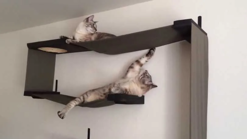 Высота настенной конструкции должна быть такой, чтобы кот, стоящий на задних лапках, мог вытянуть вверх передние – тогда пользоваться игрушкой питомцу будет удобно.