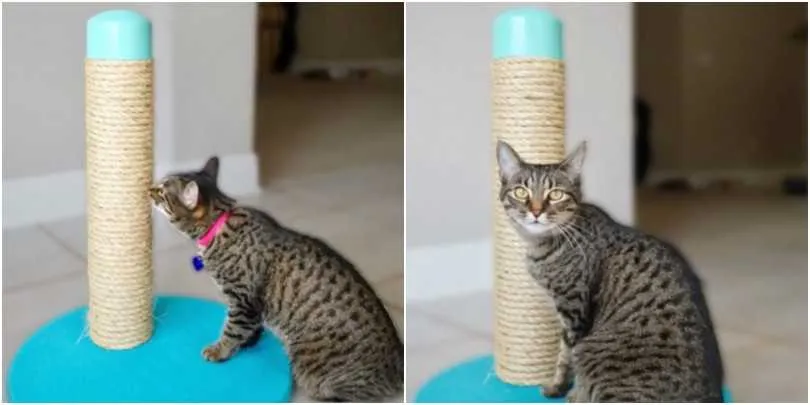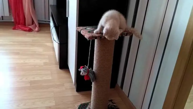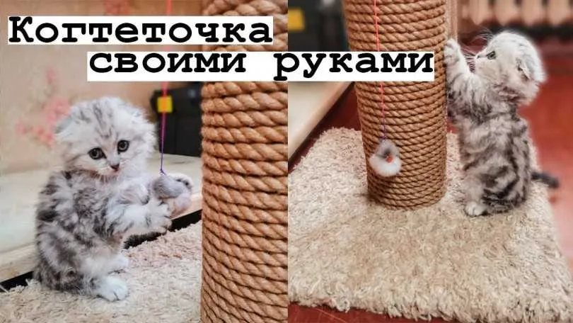 - Привязать несколько интересных небольших игрушек к верхней части когтеточки.