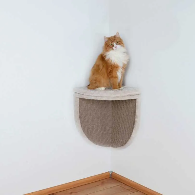 Если у вас будет стационарная когтеточка, то крепить ее нужно от стены на расстоянии минимум 20 см, а на верху можно еще дополнительно установить лежанку, своеобразную полочку. Такую полочку покрываем ковровым покрытием, но так, чтобы ворс был наружу.