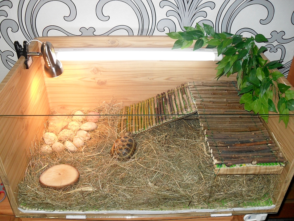 Первое время после покупки черепашка может пожить в обычной коробке. Однако, чтобы питомец оставался здоровым и активным, для него нужно будет построить террариум. Его площадь вычислить совсем несложно. Нужно взять показатели длины тела черепашки и умножить эти цифры на 5. Полученный результат будет указывать на длину одной стенки террариума.