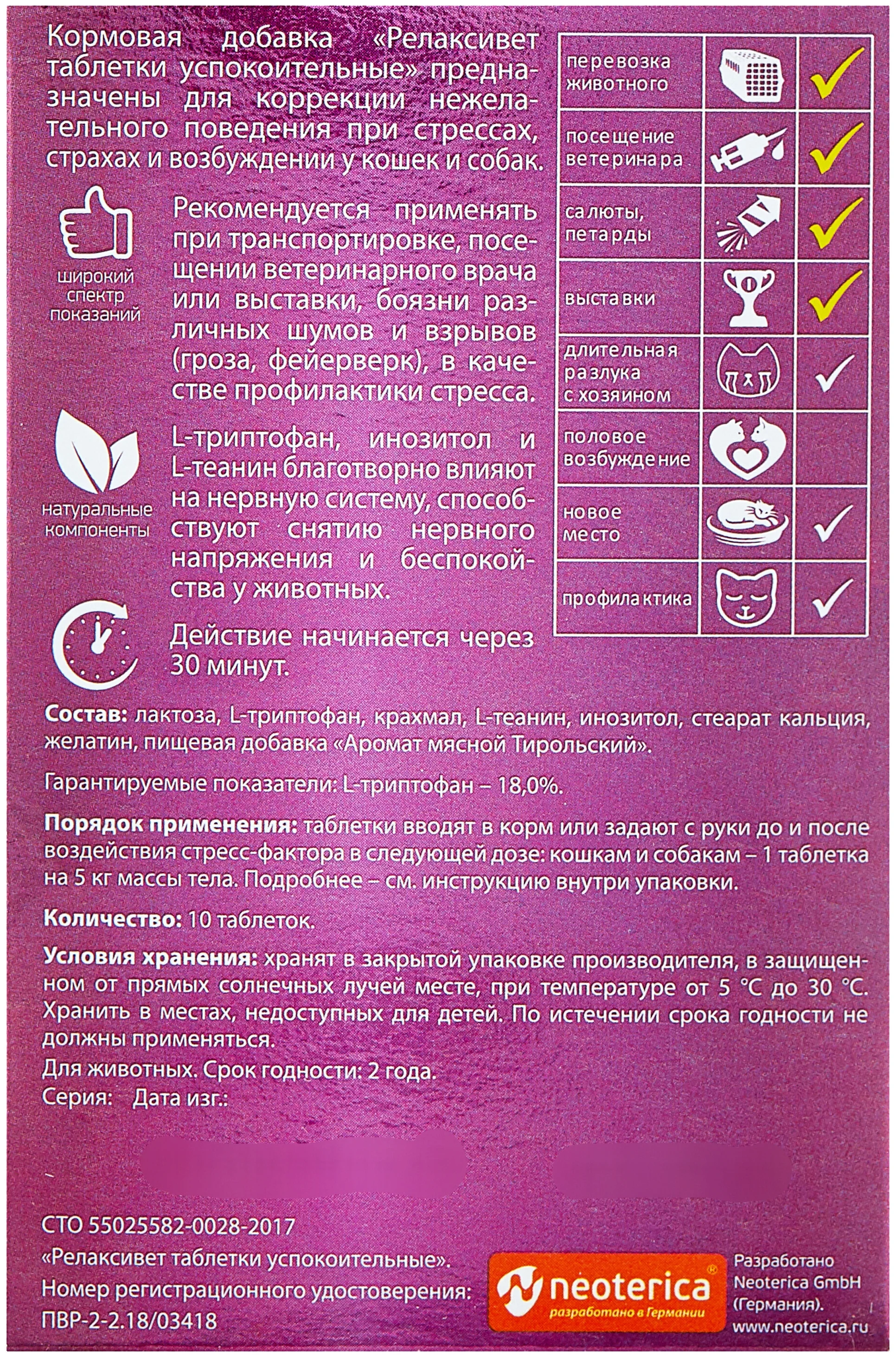 Хорошее средство. Кошки плохо переносят длительные поездки на машине, громко орут и буянят. Ранее использовала спреи и капли релаксивет, эффекта ноль. Эти таблетки дала за час до поездки на голодный желудок, подействовали через 2 часа. Думаю, что зависит от комплекции животного, у меня толстушки 5 и 6 кг. Всю дорогу, 1000 км, в машине была тишина. Удивительная эффективность при малой цене. Теперь путешествовать с любимцами стало комфортнее и для меня, и для них, нет стресса и паники.