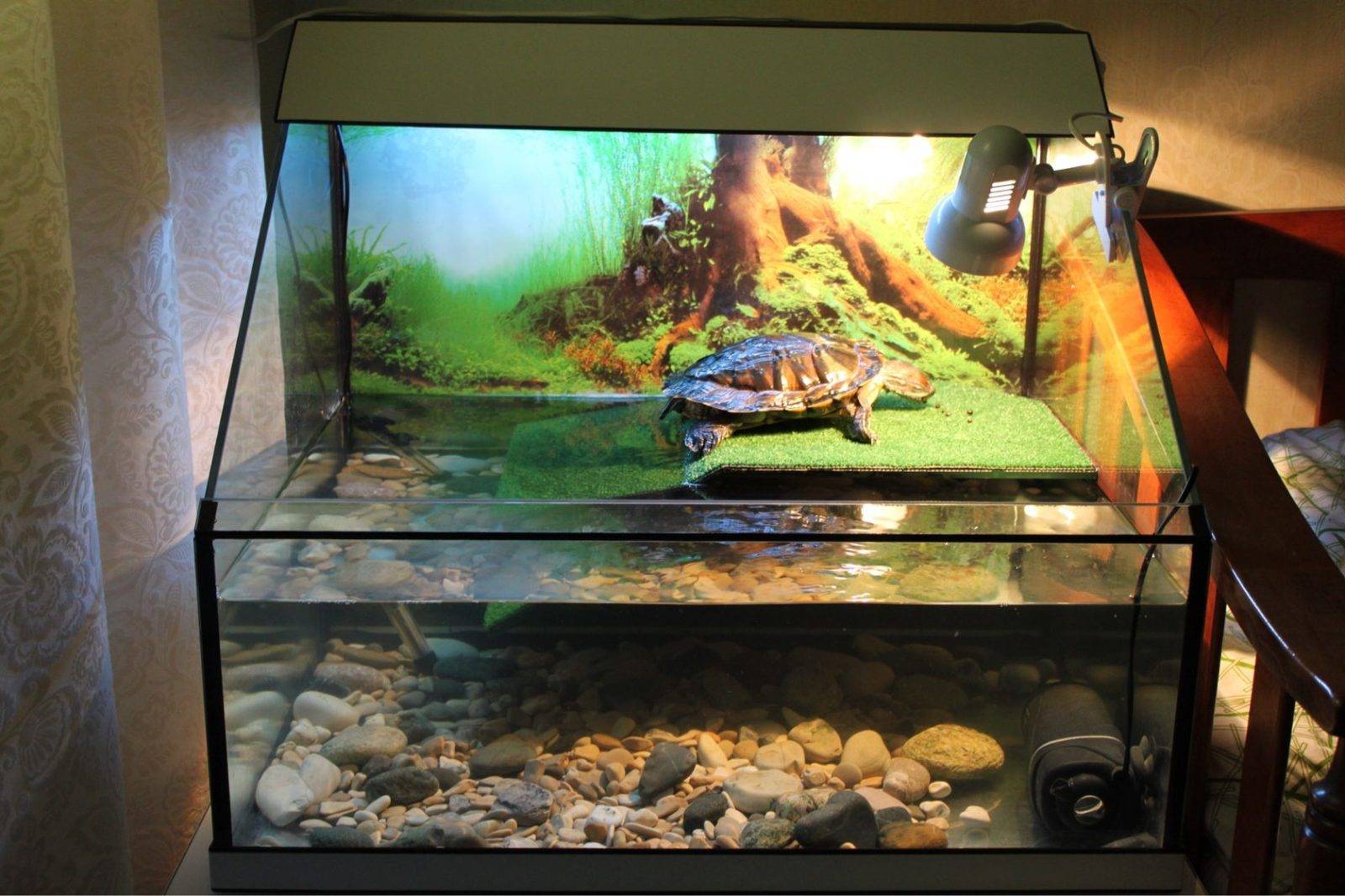 Для взрослой черепахи объем воды в акватеррариуме не должен быть менее 100 литров. При этом параметры самого акватеррариума должна позволять рептилии свободно плавать и переворачиваться.