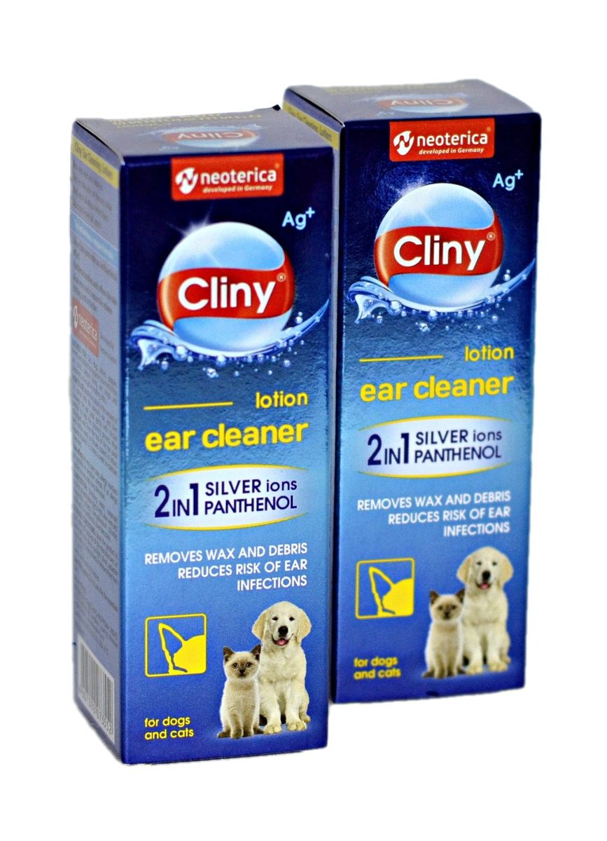 - Cliny («Клини») полезен для щенков, котят, взрослых собак и кошек, а также для кроликов и хорьков. В состав входят экстракты целебных трав (ромашки и алоэ), яблочная кислота, вода с ионами серебра. Лосьон дезинфицирует кожу внутренней стороны ушей и удаляет вязкие выделения. Его применяют вместе с лекарствами при ушном клеще и отитах. Это одно из самых первых средств для ветеринарной гигиены, содержащее ионы серебра.