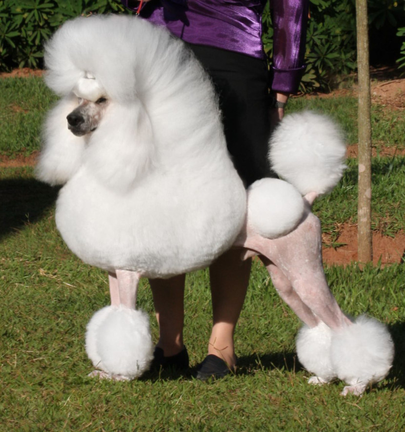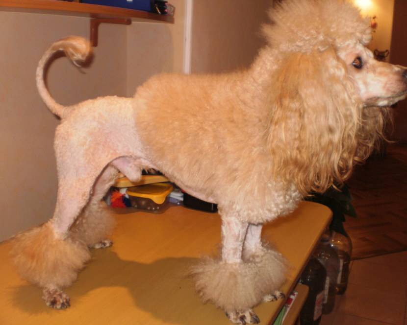 - королевскому пуделю выстригают шерсть на задних конечностях и до ребер.