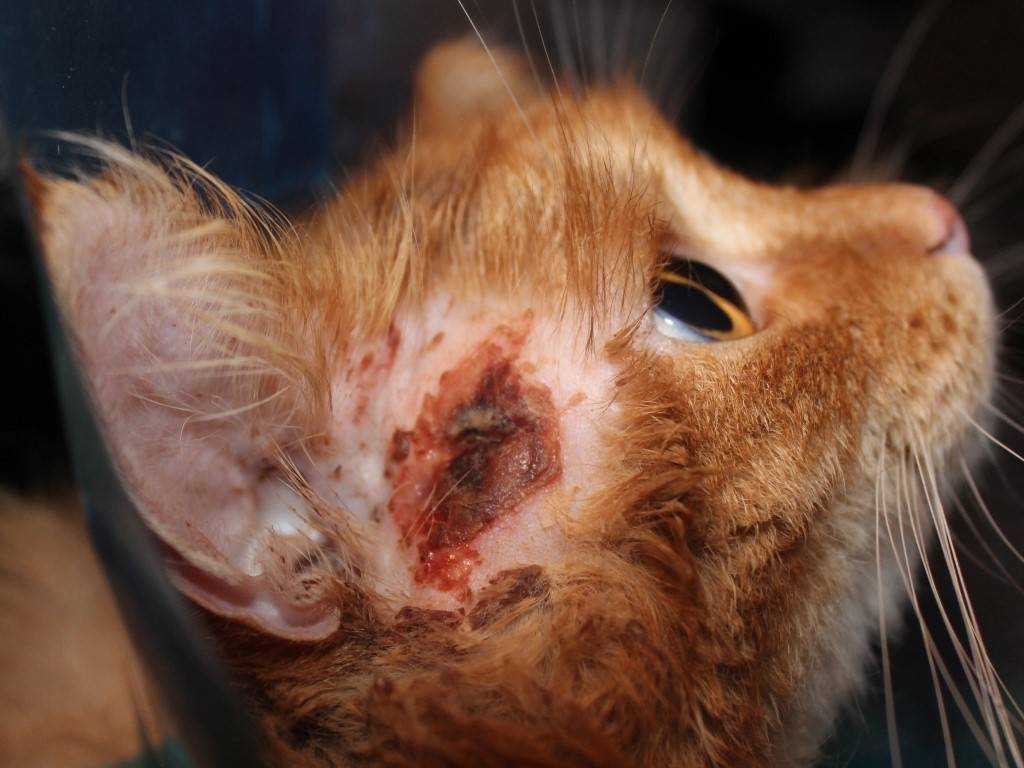 На доступных местах (ухо, нос, спина) заметить наличие ран гораздо легче, чем например, на животе или лапах.